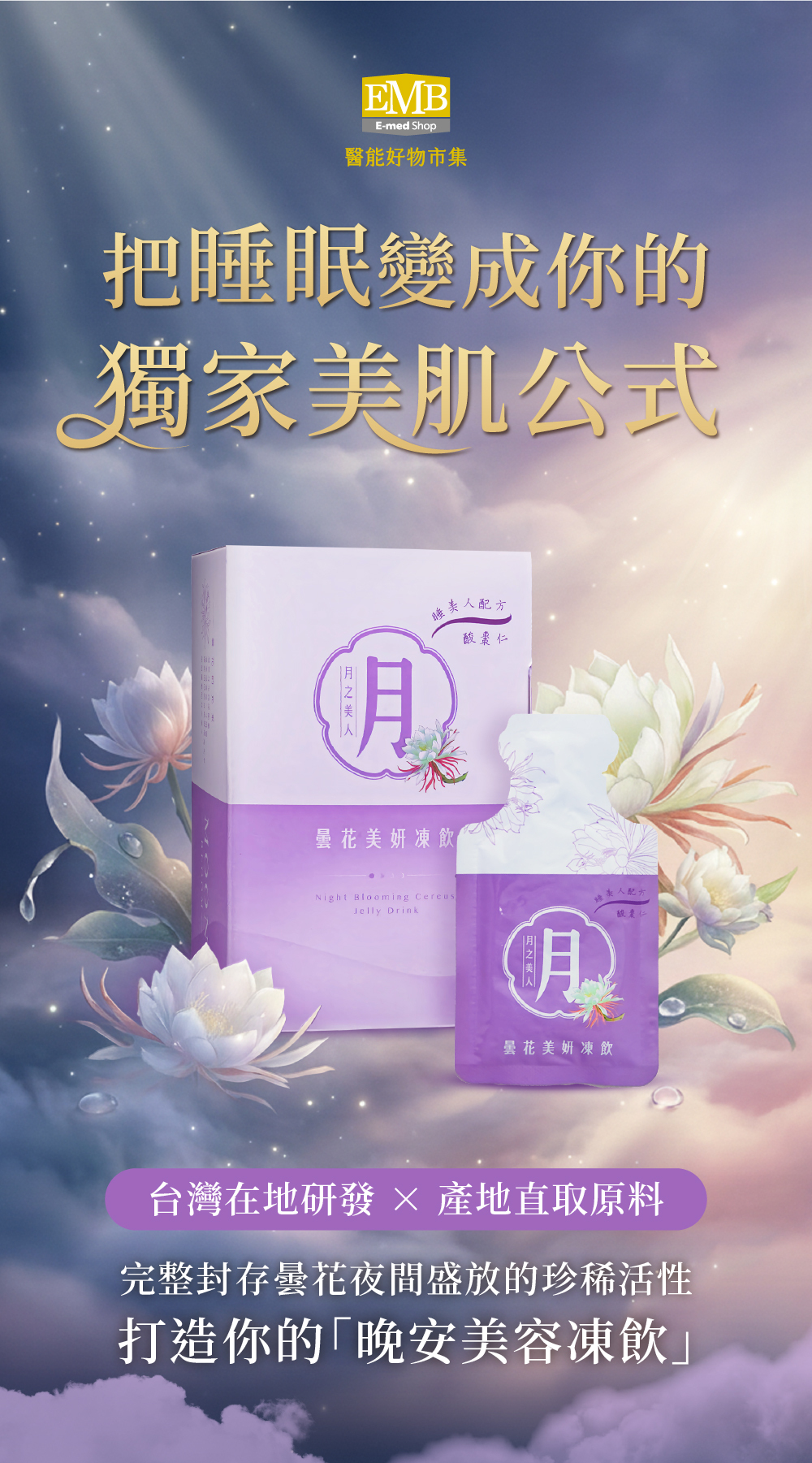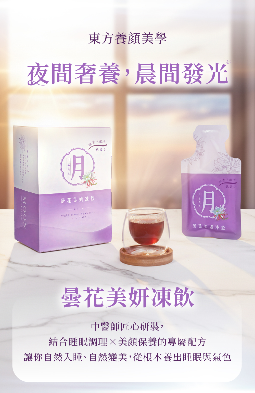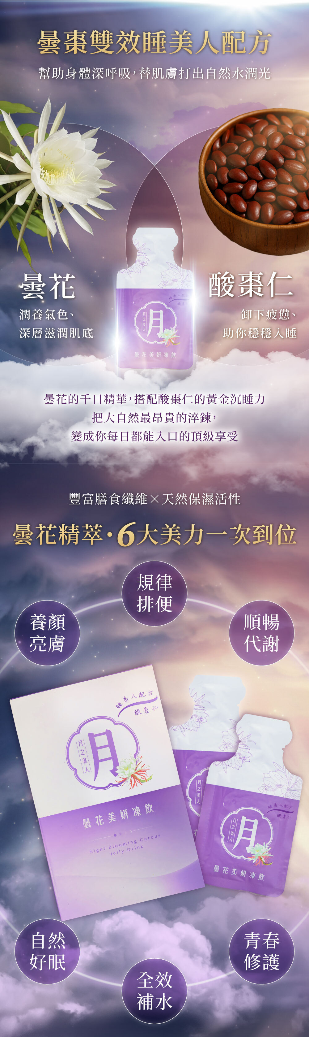 「曇花美妍凍飲」睡美人配方,嚴選台灣本地栽種曇花,搭配最高等級98級酸棗仁,打造專為現代都會人設計的睡前滋養飲品。每晚一包,啟動修復機制,深層滋潤肌膚,醒來自然綻放透亮光采。