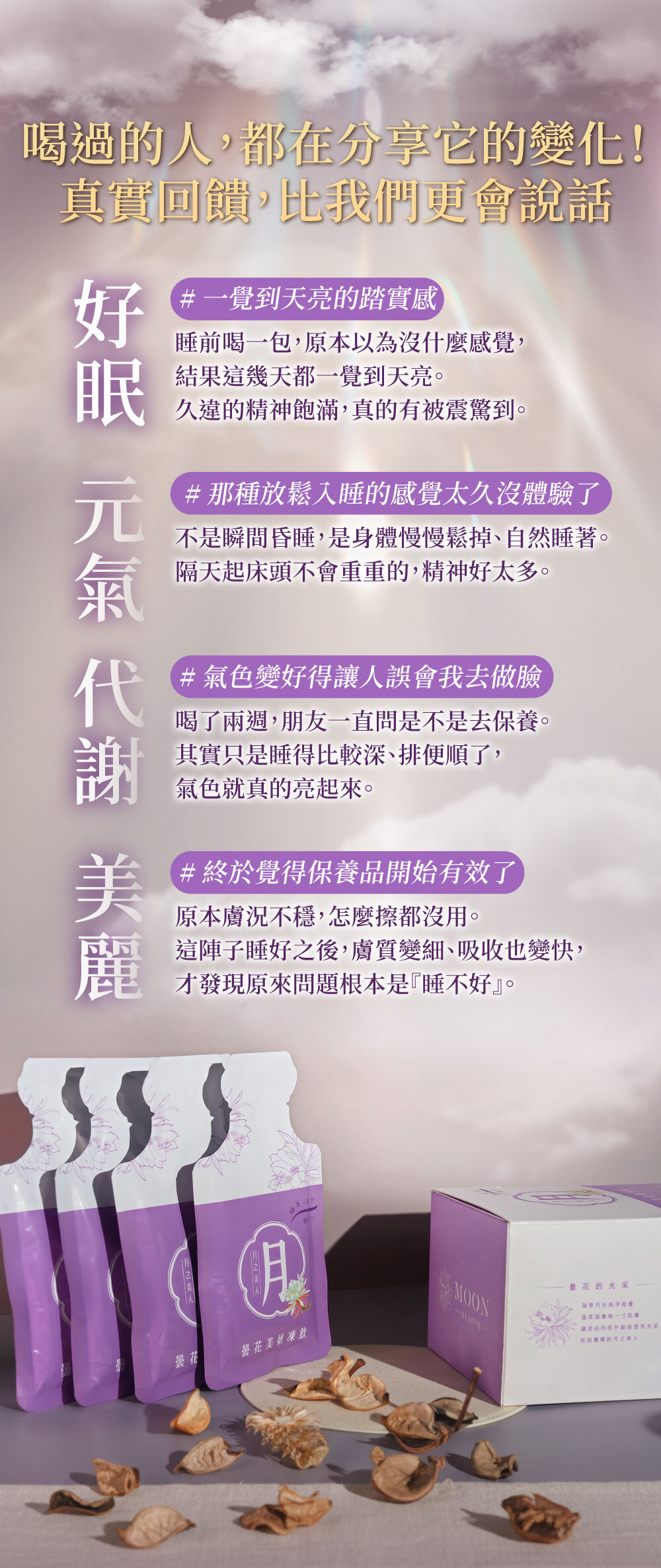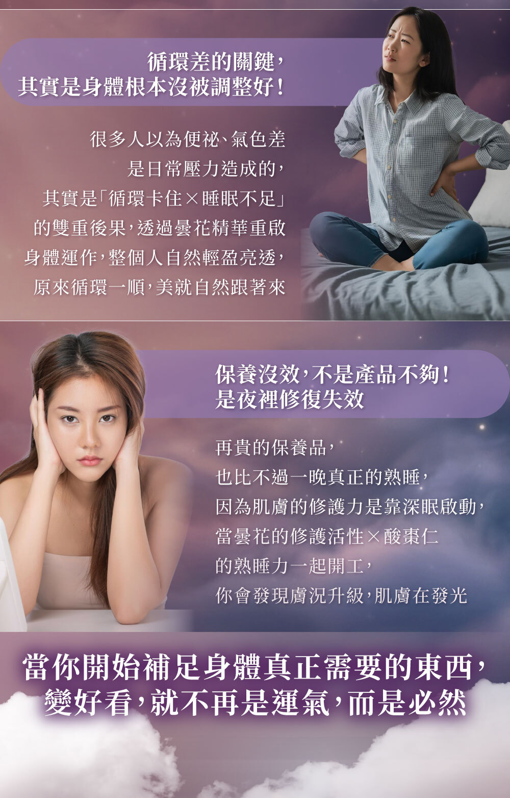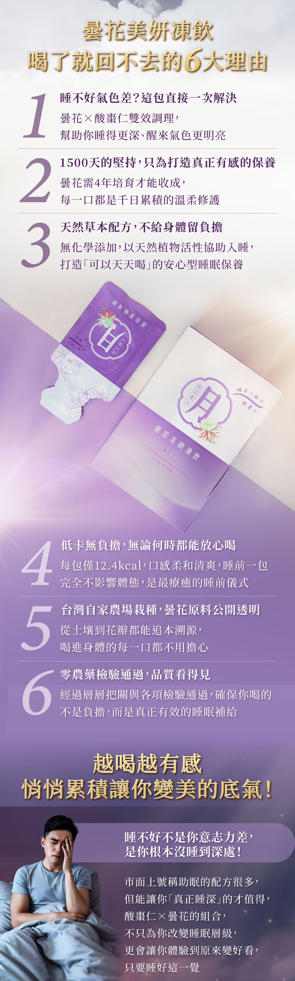 「曇花美妍凍飲」睡美人配方,嚴選台灣本地栽種曇花,搭配最高等級98級酸棗仁,打造專為現代都會人設計的睡前滋養飲品。每晚一包,啟動修復機制,深層滋潤肌膚,醒來自然綻放透亮光采。