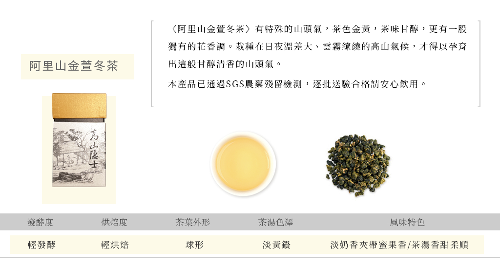 〈阿里山金萱冬茶〉有特殊的山頭氣,茶色金黃,茶味甘醇,更有一股獨有的花香調。
