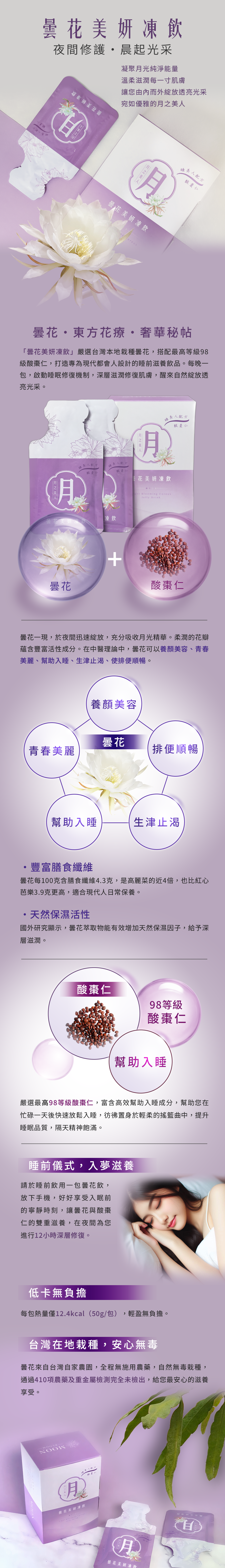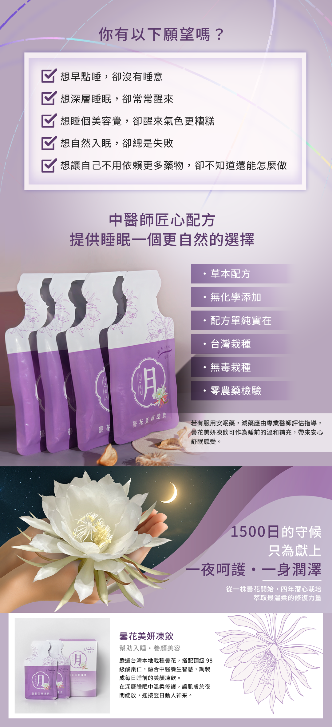 「曇花美妍凍飲」睡美人配方,嚴選台灣本地栽種曇花,搭配最高等級98級酸棗仁,打造專為現代都會人設計的睡前滋養飲品。每晚一包,啟動修復機制,深層滋潤肌膚,醒來自然綻放透亮光采。