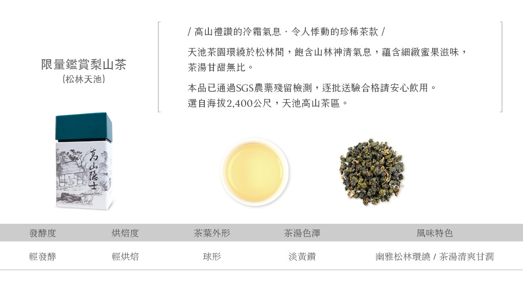天池茶園環繞於松林間,飽含山林神清氣息,蘊含細緻蜜果滋味,茶湯甘甜無比。