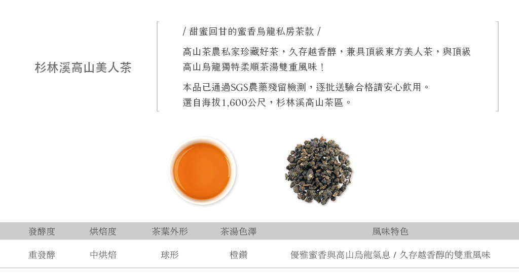 高山茶農私家珍藏好茶,久存越香醇,兼具頂級東方美人茶,與頂級高山烏龍獨特柔順茶湯雙重風味!